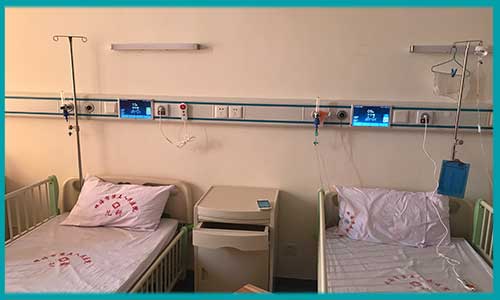 珠海第五人民医院智慧病房呼叫系统包括护士站呼叫主机,病房呼叫分机、走廊显示屏、卫生间紧急按钮等。