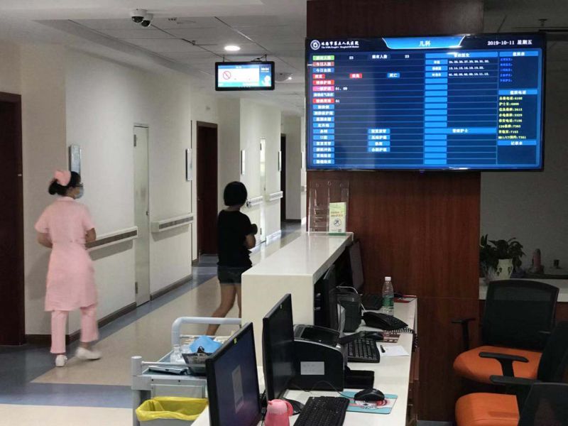 护士站墙上设置医用传呼系统主机,距地11.4m,分机安装在铝合金设备带上,中心高度为1.4m,走廊大屏幕床显示器安装在走廊中间,安装高度为2.5m,分线盒安