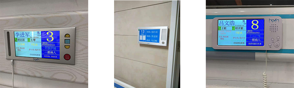 上图为新款病房呼叫器分机,带有液晶显示屏,屏幕可以显示患者信息、护理等级、禁忌、医嘱等,可以安装在医疗设备带上,也可以直接安装在墙壁上。