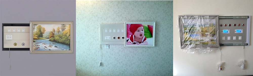 上图为隐藏式壁画呼叫器安装方式,推拉式壁画设计,平时不用时可以关闭隐藏呼叫器分机、气体终端、开关插座等形式