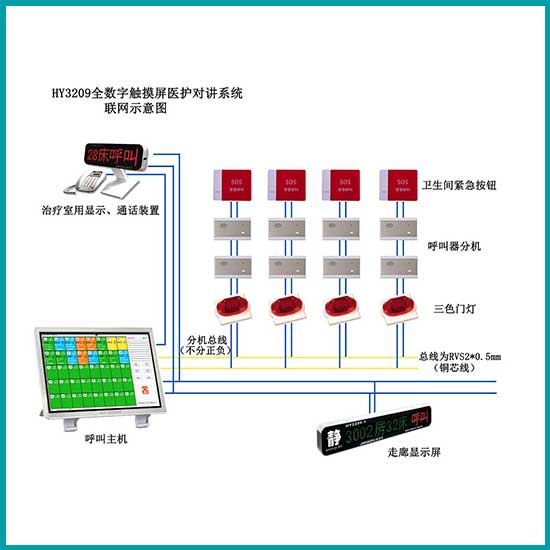 一般由护士站主机、病房呼叫分机、走廊显示屏、门口机、门灯、卫生间紧急按钮等组成。